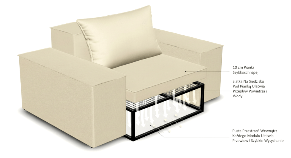Siedzisko nie zatrzymuje wody. Zastosowano w nim szybkoschnącą piankę, która nie chłonie wilgoci jak standardowe wypełnienia, oraz metalową siatkę podparcia, dzięki której woda swobodnie przepływa i nie zalega wewnątrz konstrukcji. Brak pełnych, zamkniętych powierzchni wewnątrz mebla ogranicza ryzyko gromadzenia wilgoci.