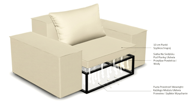 Stelaż sofy wykonany jest z materiałów odpornych na wilgoć i zabezpieczonych przed korozją. Elementy metalowe są galwanizowane w sposób porównywalny do zabezpieczeń stosowanych w motoryzacji, co chroni je przed utlenianiem i długotrwałym działaniem warunków atmosferycznych.